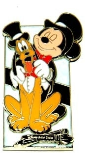 In September, 2005, Walt Disney World hosted a pin event at Epcot. The theme for this event was “The Happiest Pin Celebration on Earth” and featured a series of pins honoring Disney films, theme parks, and characters. This beautiful Artist Choice pin honors the leader of the club and his faithful friend. Mickey Mouse is dressed in a tuxedo, and is leaning over Pluto the adjust his tux bow tie. The beautiful pin is trimmed in silver and the features the Artist Choice logo, the crossed pencil and paint brush, at the bottom. The pin is mint on original event picture card. Limited edition of 1000, Pin pics id 38378.